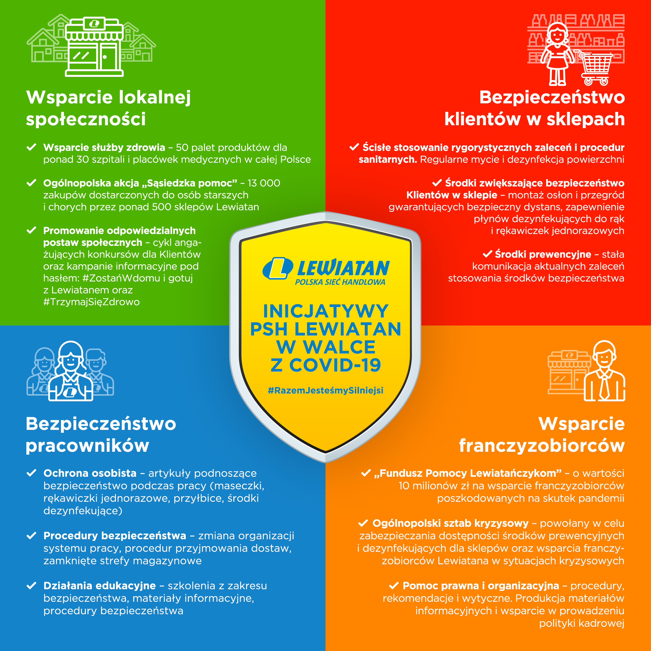 W ramach inicjatywy #RazemJesteśmySilniejsi Sieć Lewiatan przekazała ponad 50 palet produktów, takich jak woda, środki dezynfekujące i artykuły higieniczne. Otrzymało je ponad 30 szpitali i placówek medycznych w całej Polsce. Od początku pandemii ponad 500 sklepów Lewiatan zrealizowało także 13 000 zamówień na zakupy dla osób starszych i chorych w ramach akcji „Sąsiedzka pomoc”. Dzięki współpracy PSH Lewiatan, Spółek Regionalnych, franczyzobiorców i partnerów handlowych wsparcie regularnie trafia również do lokalnych społeczności. Działania obejmują także akcje edukacyjne skierowane do pracowników i klientów, promujące odpowiedzialne postawy i bezpieczeństwo w robieniu zakupów.