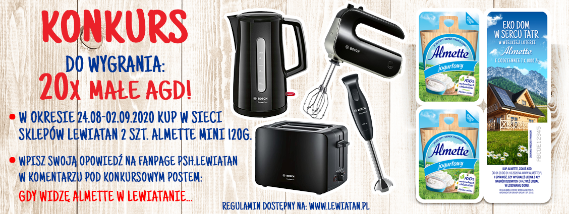 "Gdy widzę Almette w Lewiatanie" to nowy konkurs, który od 24 sierpnia prowadzony jest na fanpage'u PSH Lewiatan na Facebooku. Na zwycięzców czekają atrakcyjne nagrody: 20x małe AGD